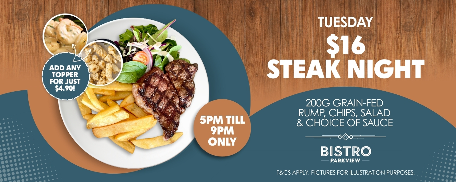 TUESDAY $16 STEAK NIGHT + $4.90 TOPPERS